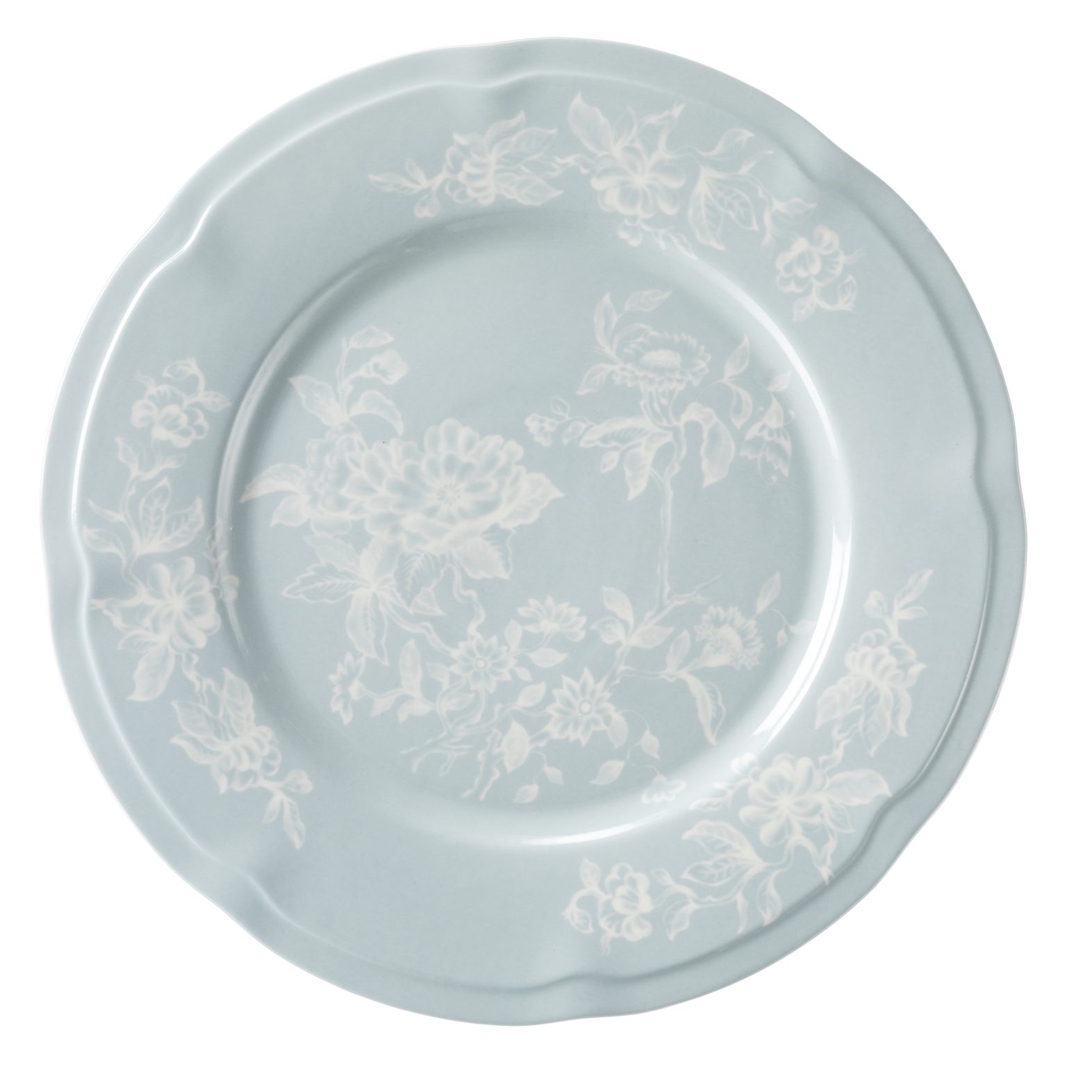 A mist blue ceramic charger plate adorned with delicate white floral detailing and a softly scalloped edge. The heirloom-inspired motif balances romantic nuance with modern precision.