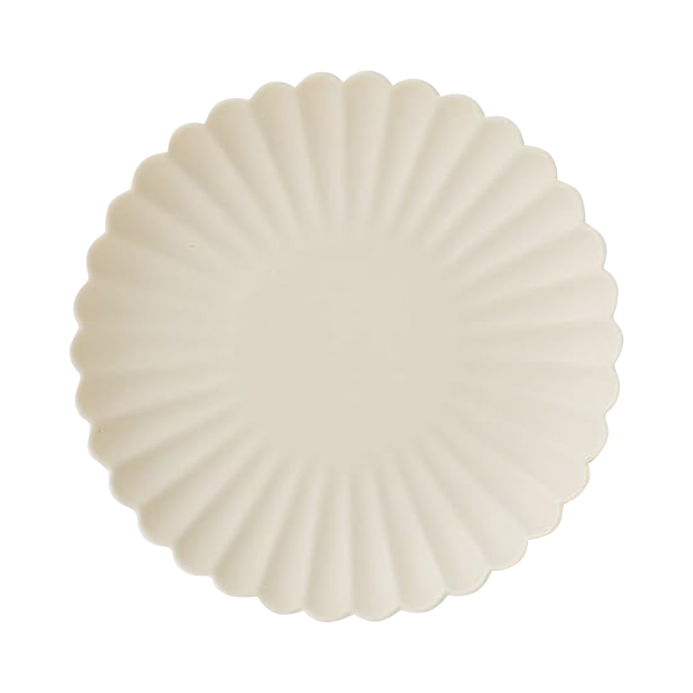 The perfect little bread/appetizer plate in a soft cream color with a sculpted scallop edge and subtle sunburst texture, perfect for layering into coastal or classic table settings.