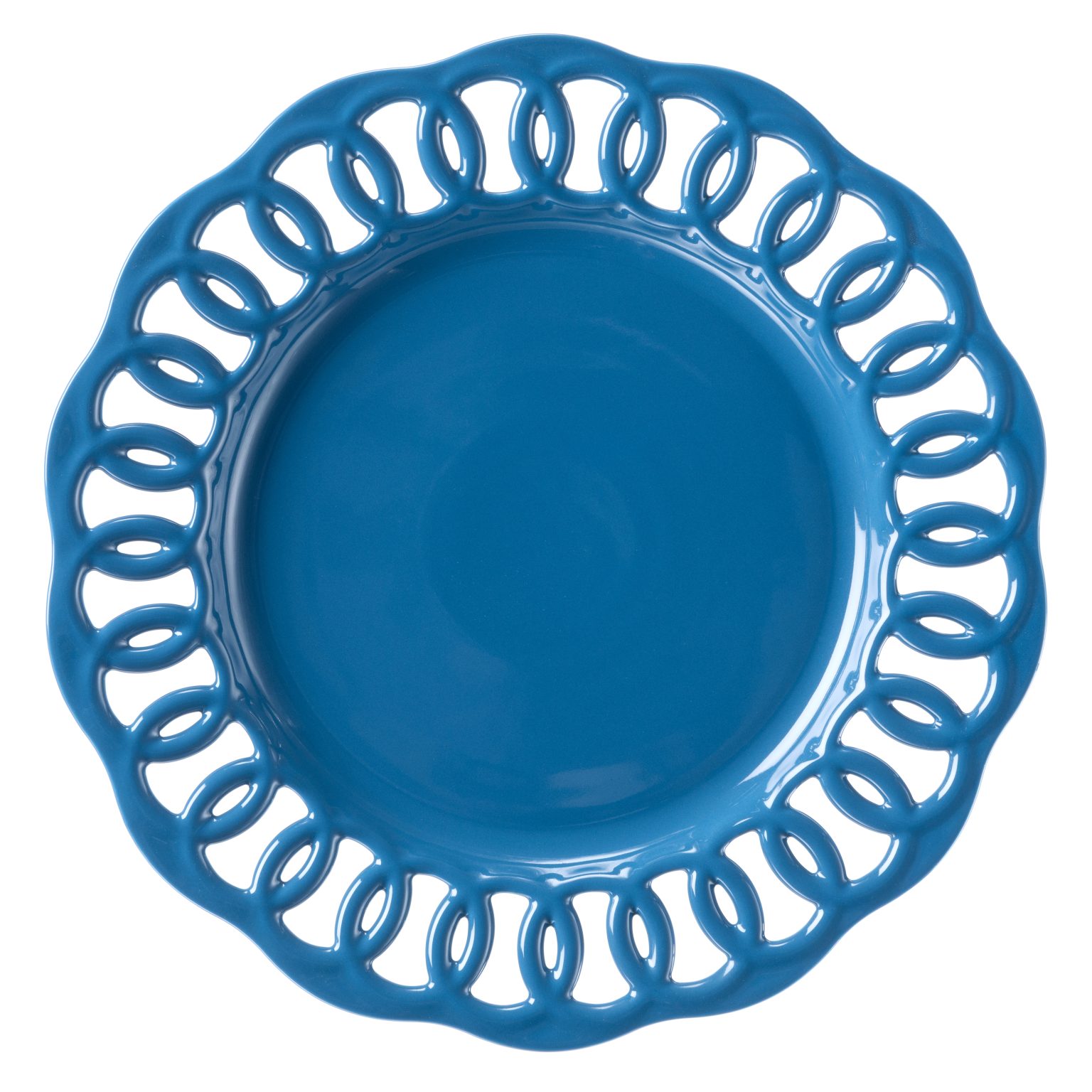 A glazed ceramic charger plate in luminous cornflower blue with a sculptural pierced rim. The high-gloss finish enhances reflection and depth, while the dimensional edge introduces architectural presence.